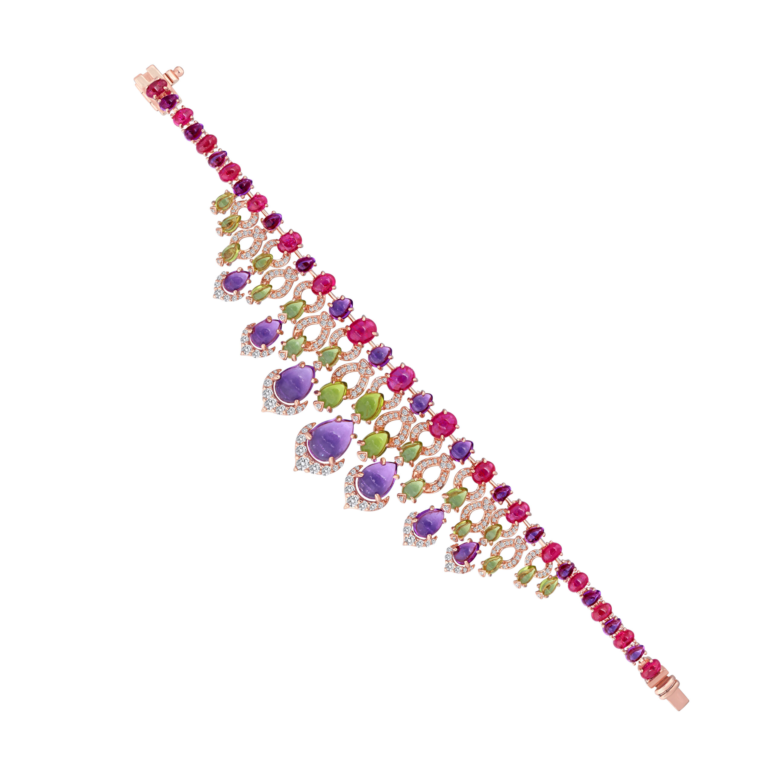 Cuff Bracelet in White Swarovski Zirconia with Man Made Amethyst, Emeralds And Rubies Set In Rose Gold Plating