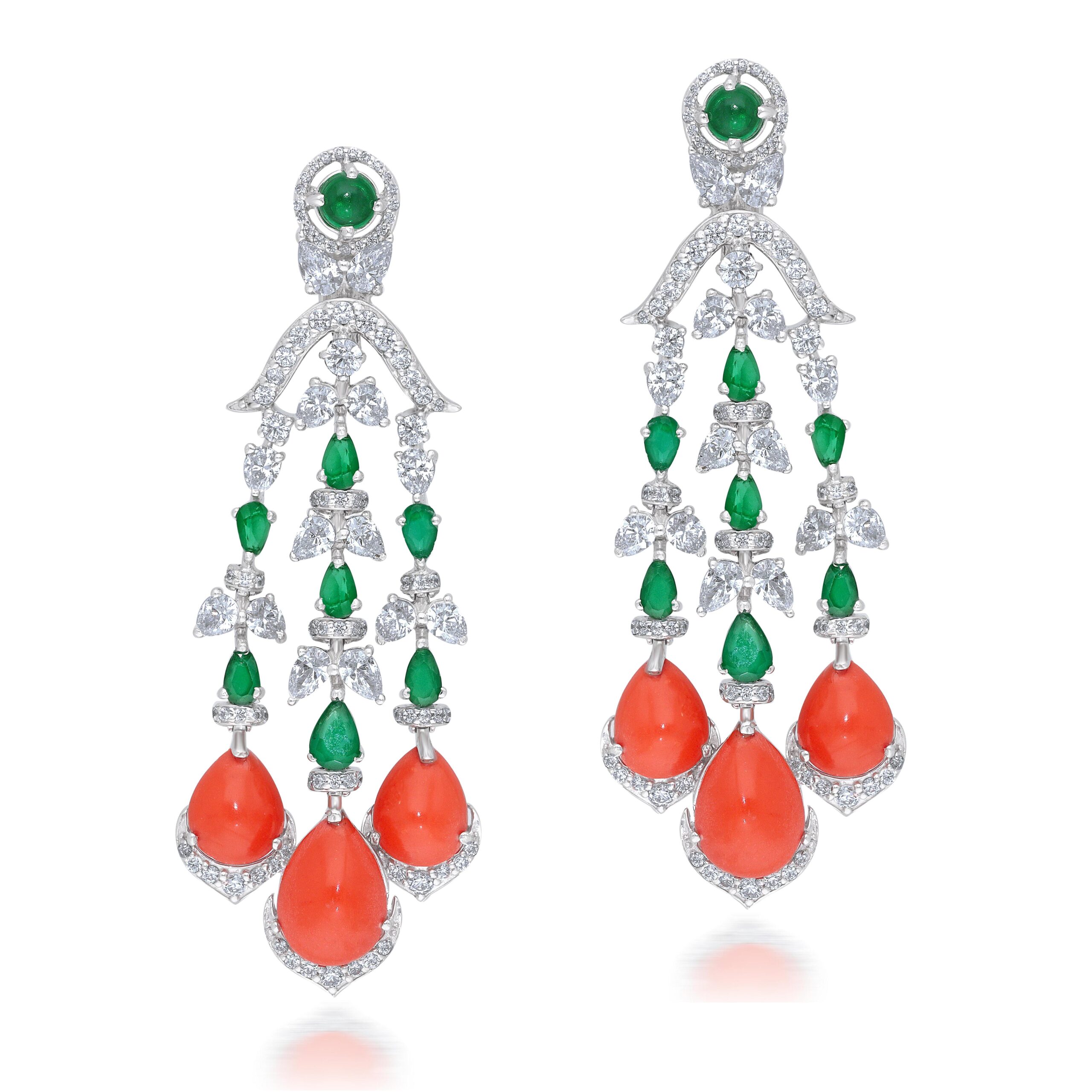 Bridal Earrings in White Swarovski Zirconia With Man-Made Corals & Emeralds