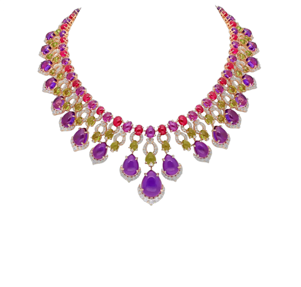 Bridal Neck Piece in White Swarovski Zirconia with Man Made Amethyst, Emeralds And Rubies Set In Rose Gold Plating