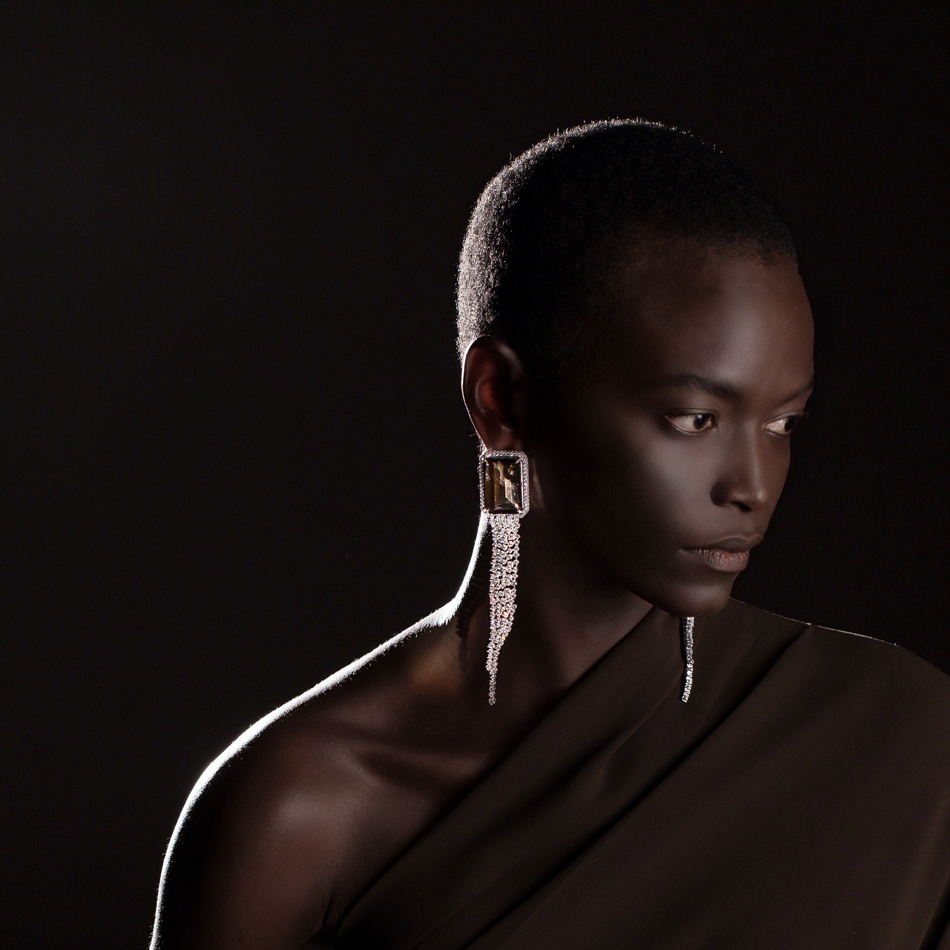 Earrings in emerald cut Smoky Topaz with a rainfall of round Swarovski Zircons