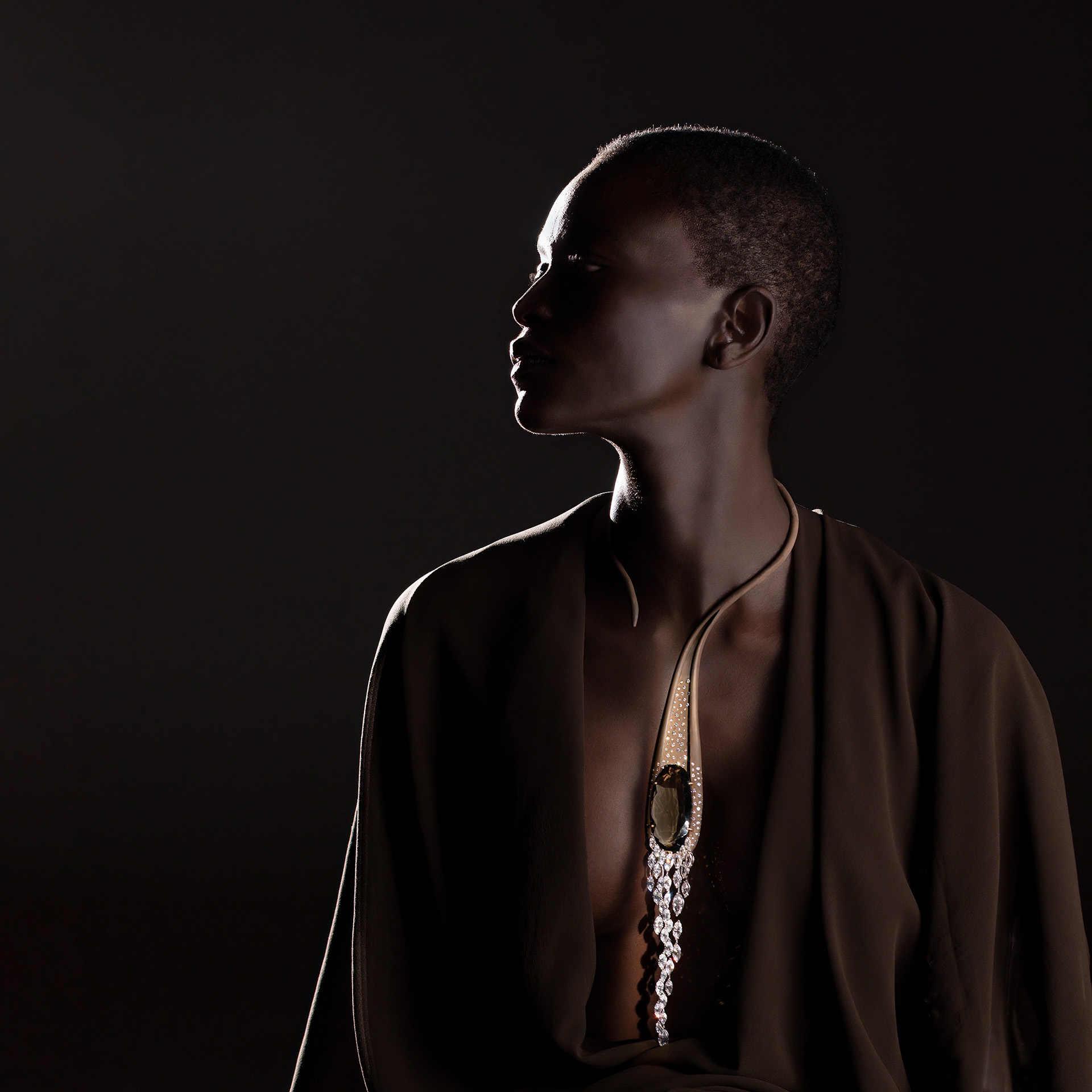 Snake necklace in brushed bronze, Smoky Topaz and a cascade of marquise shaped Swarovski Zircons.