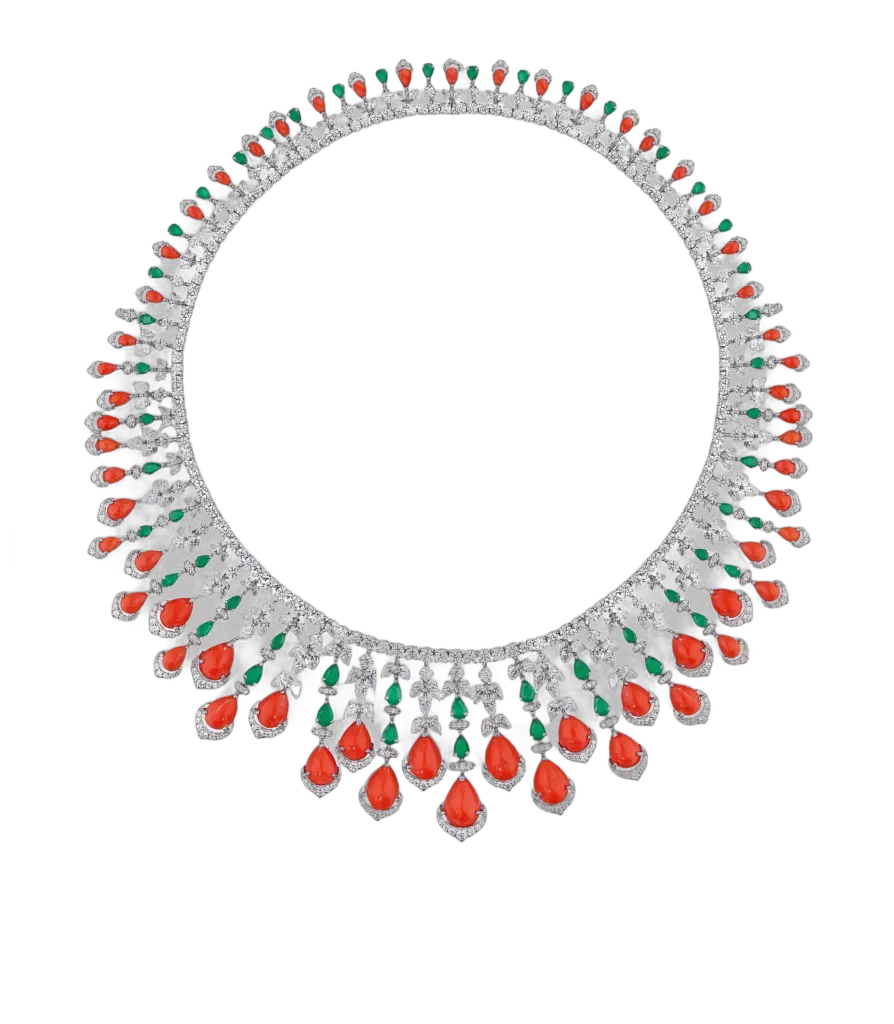 Necklace in White Swarovski Zirconia with Man-Made Emeralds & Corals