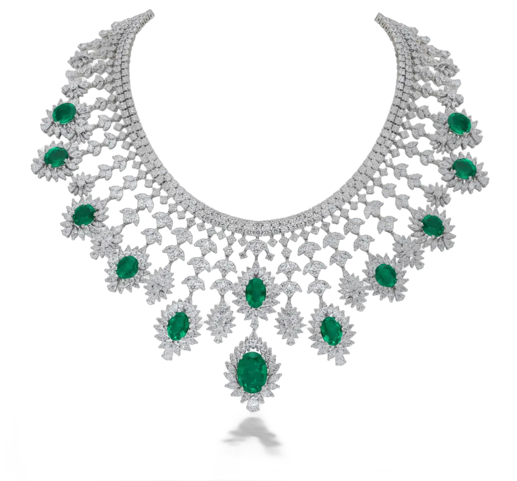 Necklace in White Swarovski Zirconia with Pear Shaped Man-Made Emeralds