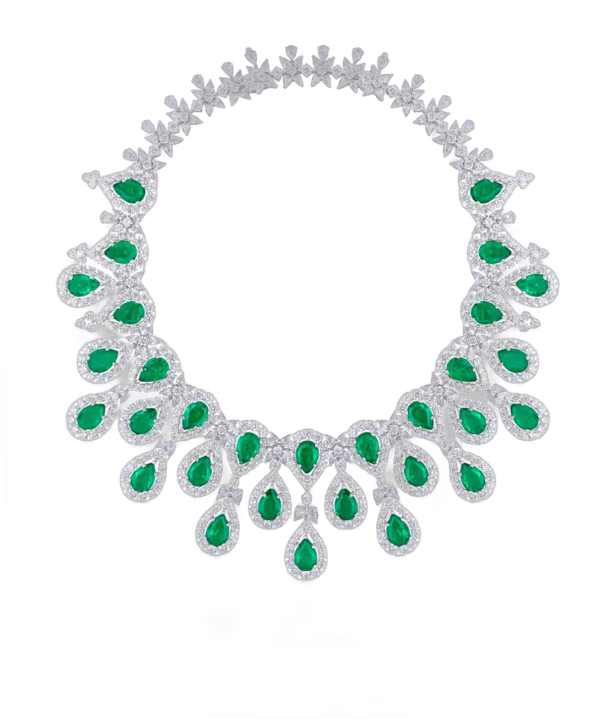 Necklace in White Swarovski Zirconia with Pear Shaped Man-Made Emeralds