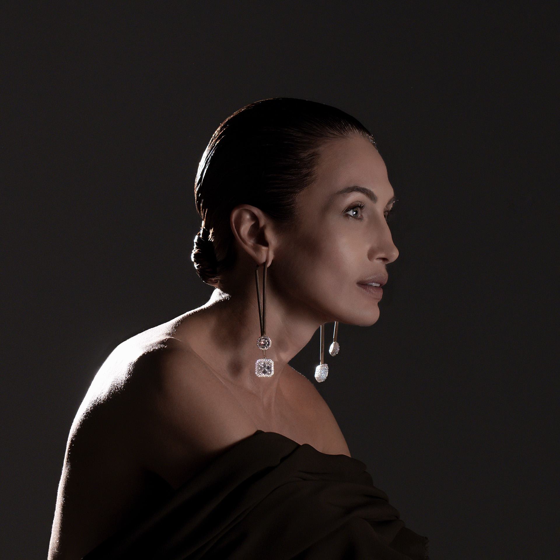 Earrings in Brushed Bronze with two pendants, in princess and brilliant cut Swarovski Zirconia